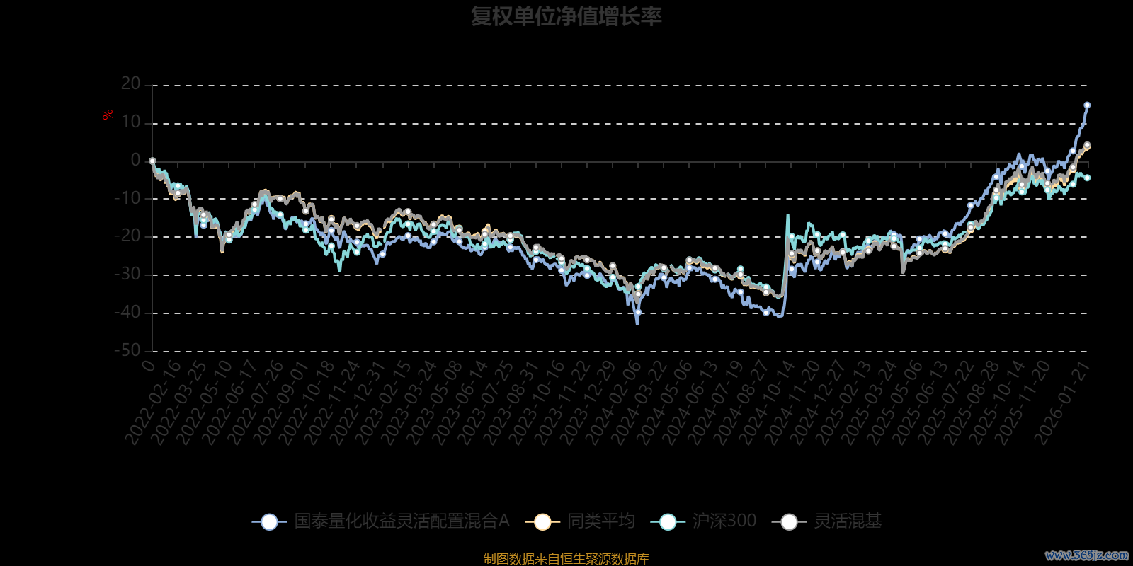 截至1月21日,国泰量化收益灵活配置混合A近三个月复权单位净值增长率为15.44%,位于同类可比基金228/1286;近半年复权单位净值增长率为31.50%,位于同类可比基金409/1286;近一年复权单位净值增长率为50.51%,位于同类可比基金314/1286;近三年复权单位净值增长率为44.85%,位于同类可比基金214/1286。