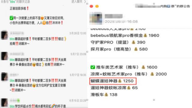 事实上,不仅二手平台,在社交媒体上还充斥着大量的宝妈内购群,具体操作是:要什么产品,查看群公告价格,微信转账下单。价格通常要大幅低于官方价,以 BeBeBus 的蝴蝶遛娃车为例,内购群 1250 元比官方售价低了约 30%。
