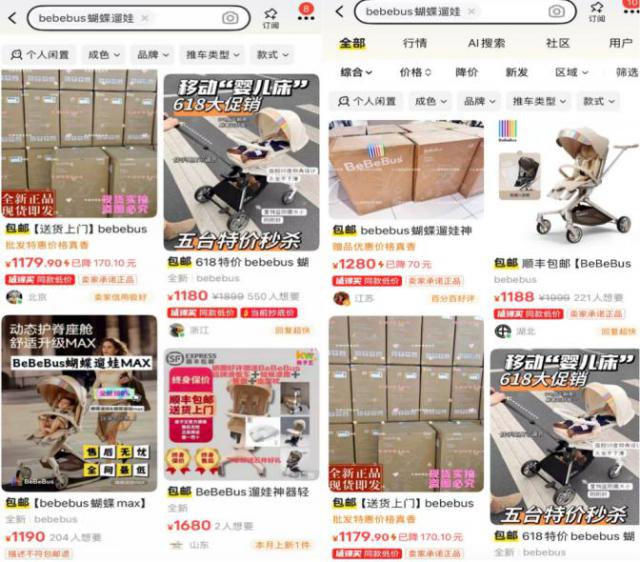 AI 蓝媒汇在闲鱼上搜索 BeBeBus 蝴蝶遛娃车发现,鲜有二手转卖者,更多的是打着"全新正品"标签的商家。